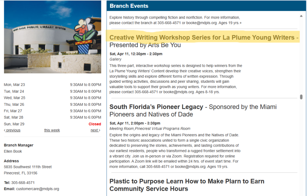 Free Creative Writing Workshops (series of 3) in person to all recipients: Miami-Dade Pinecrest Library | 5835 SW 111th Street, Pinecrest, FL 33156 12-30pm – 2:30pm